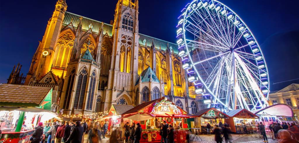 À environ 2h30 de Strasbourg, Metz offre un marché de Noël moins centré sur les traditions alsaciennes, mais très élégant.